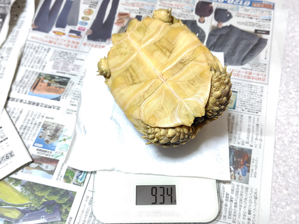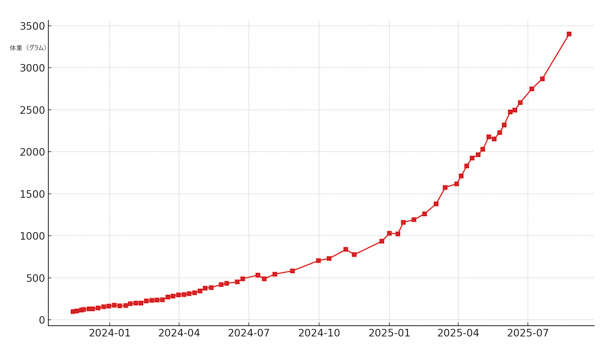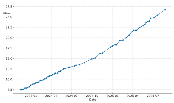 - 現在(2025/8/24):甲長26.7 cm、体重3,400 g(3000gを超えてから人間用体重計で計測)